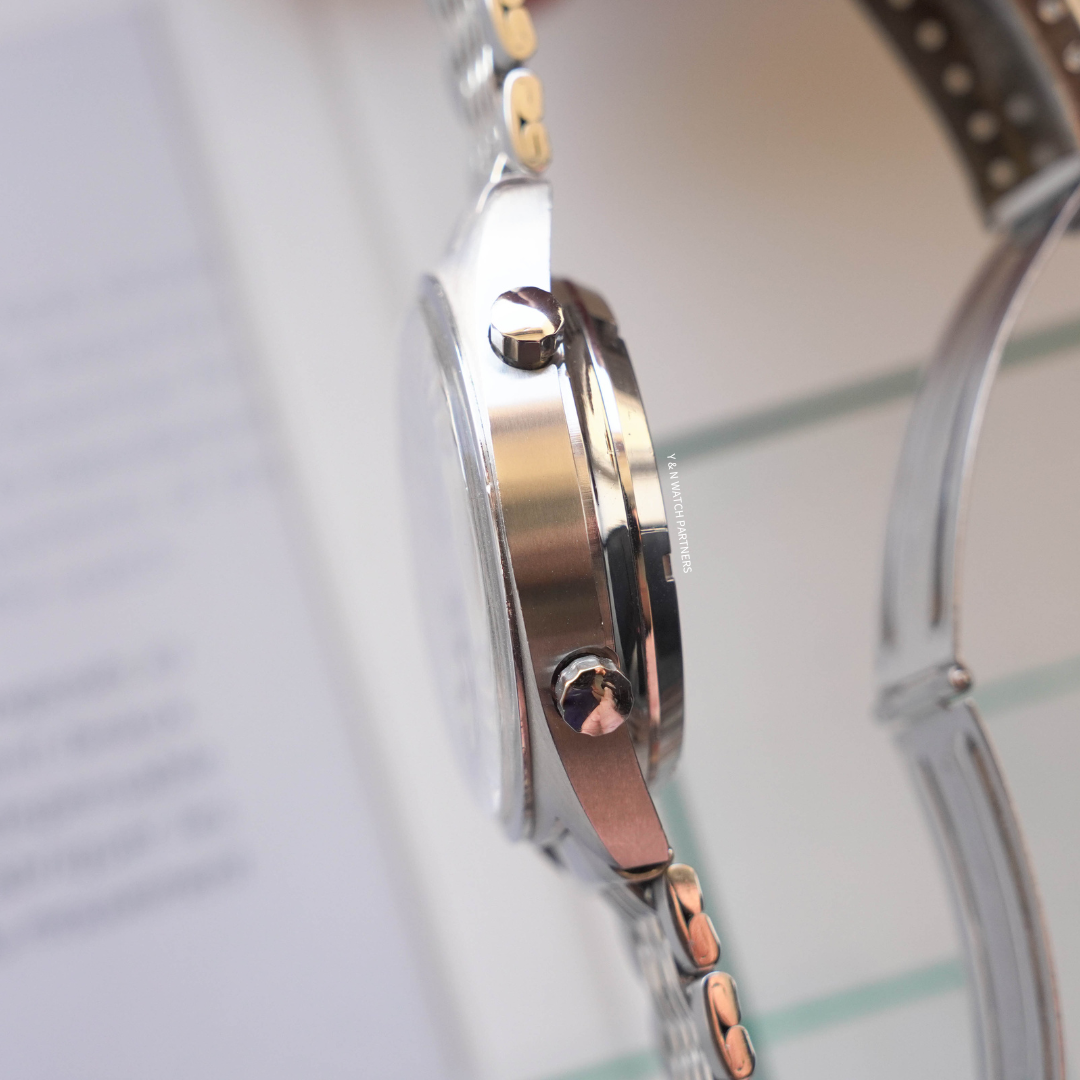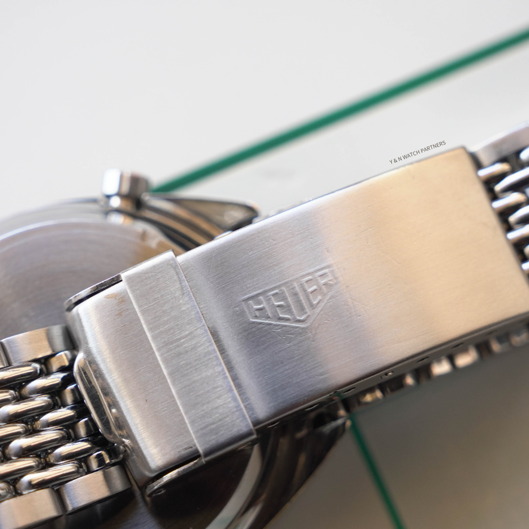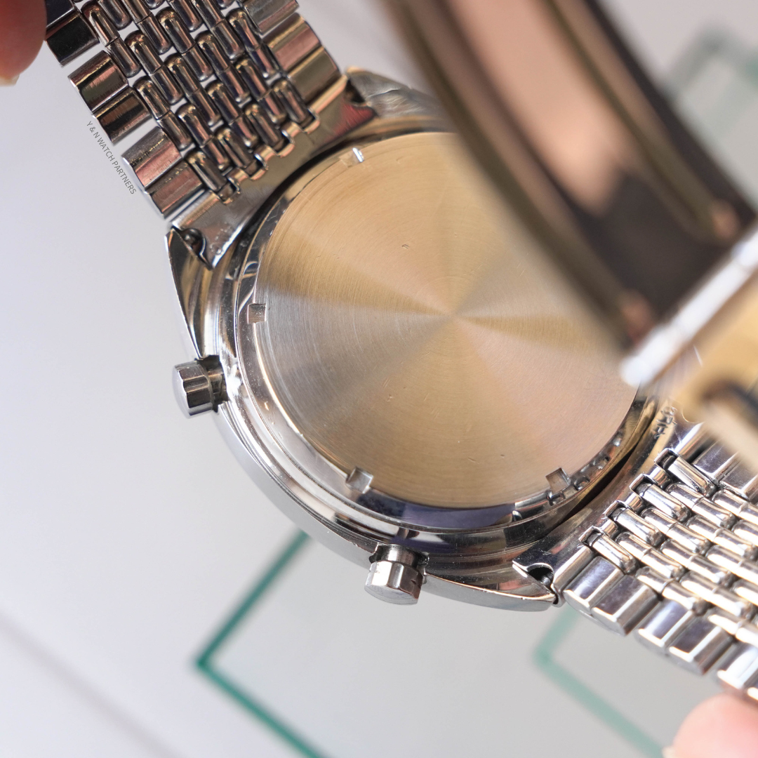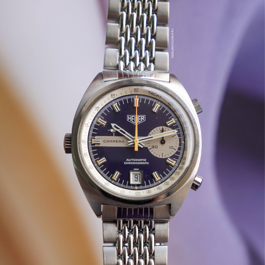 This Heuer Carrera 1553 from the 1970s is highly sought after by collectors, thanks to its striking deep blue dial and the Carrera inscription at 9 o'clock. Its unique visual identity subtly nods to the iconic color scheme of Martini Racing, with delicate orange and blue accents that pay homage to the golden age of motorsport. Inside, it is powered by the automatic Calibre 15 chronograph movement, renowned for its robust construction and distinctive asymmetrical dial layout. The minute counter is at 3 o'clock, the small seconds at 10, and the date window at 6. The vibrant orange central seconds hand adds a bold, sporty touch to the design. Another rare highlight is the original Gay-Frères stainless steel bracelet, which is itself a collector's item—rare, high-quality, and highly sought after.