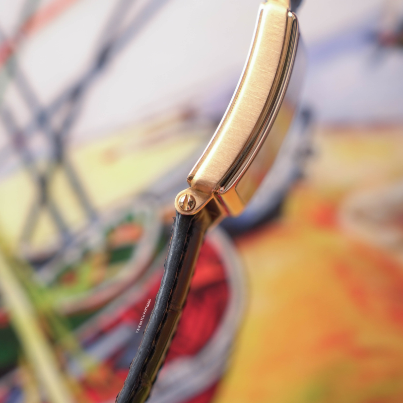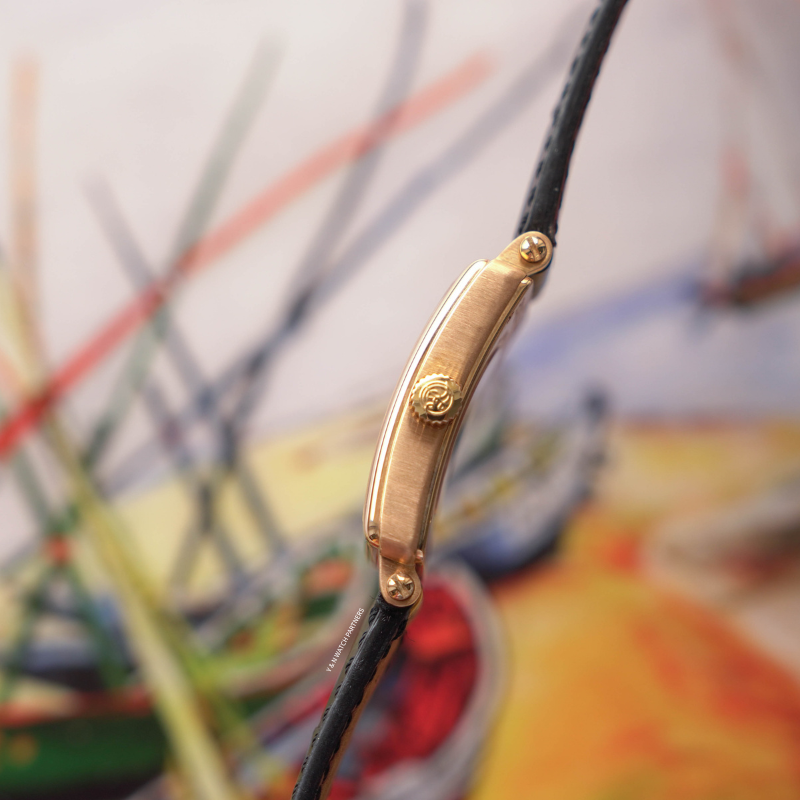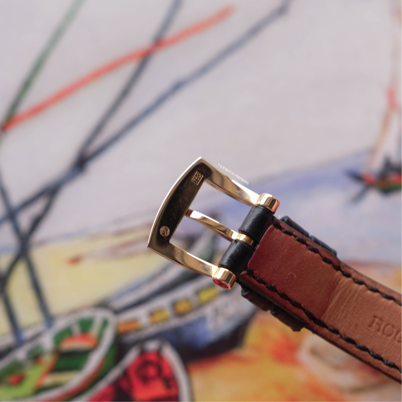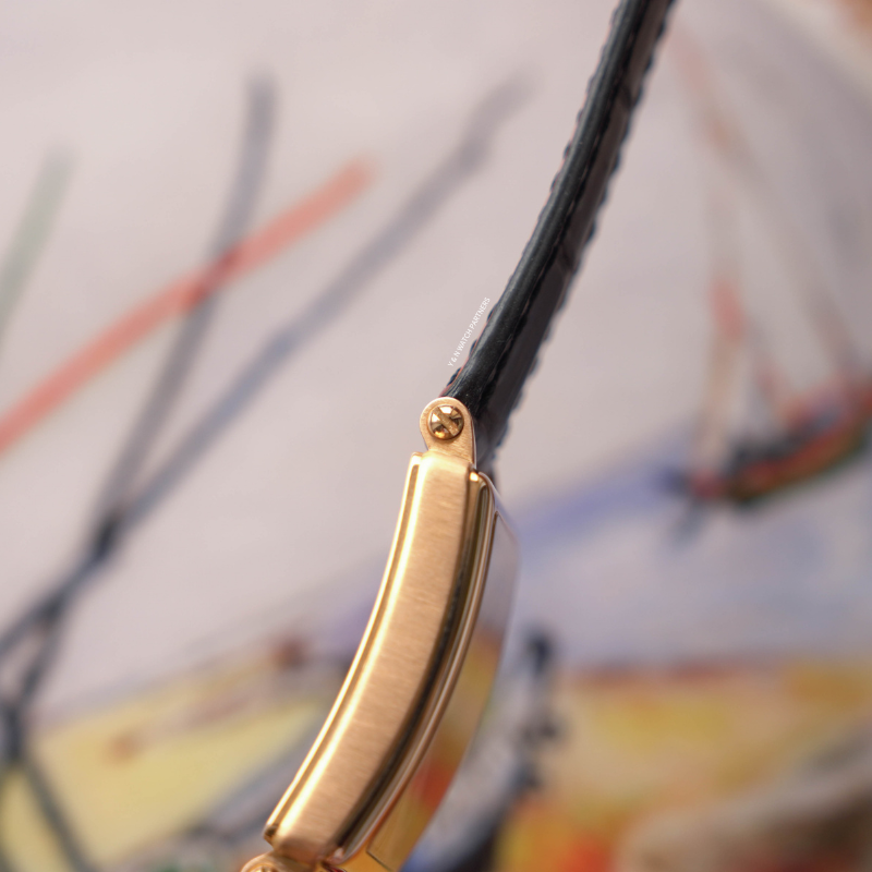 Powering the watch is the manually wound Cal. RD18, one of the key early movements that established Roger Dubuis’ technical reputation. It bears the prestigious Geneva Seal, ensuring that every detail—from plates and bridges to beveling and screws—is meticulously hand-finished to the highest standards. The movement is also equipped with an elegant swan-neck regulator for fine adjustment, alongside the traditional gold chaton setting—hallmarks of classical haute horlogerie.