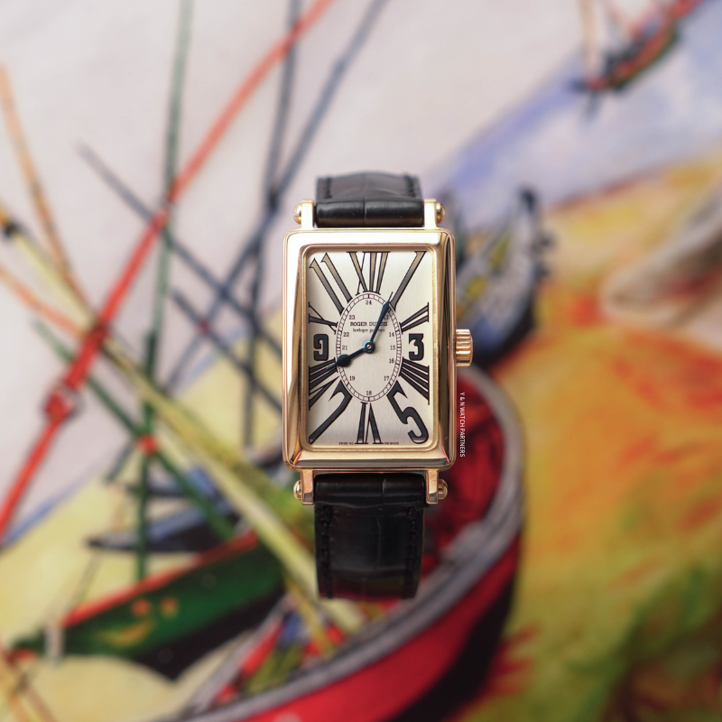 This is the spirit of Roger Dubuis’ MuchMore collection. Its “more” is immediately evident on the dial. The M28 adopts the classical rectangular silhouette of 1920s wristwatches, yet completely rejects the restrained aesthetic typical of traditional dress pieces. Instead, the dial is filled with exaggerated, distorted Roman and Arabic numerals, intertwined and radiating outward from the center. Each numeral is elongated and dramatically flared, pushing toward—almost breaking through—the boundaries of the case, creating a sense of bold, almost aggressive visual energy.